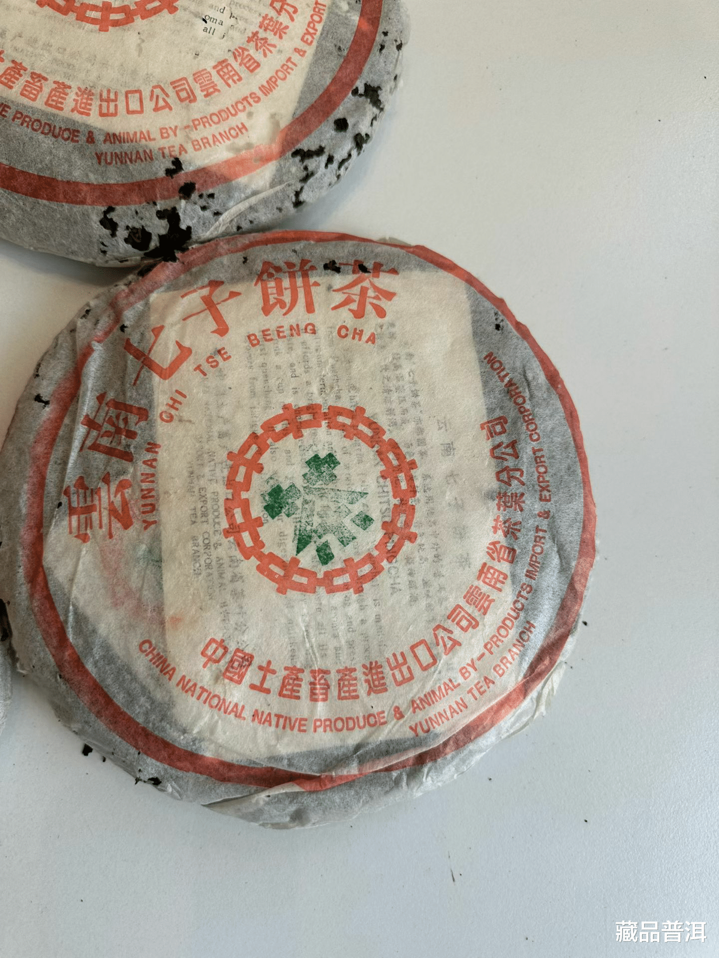 1993年7572熟饼的棉纸比较薄,透过棉纸能看到内票上的文字。茶版中间八中茶商标的“茶”字为手工盖印,每饼的盖印位置、油墨深浅均有差异,也是辨别其真伪的重要依据之一。