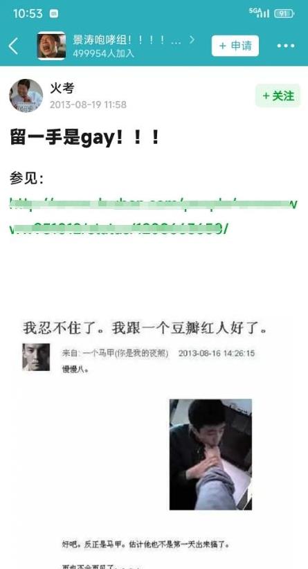 在2013年8月的一个帖子中,一位名叫【火考】的网友自称和留几手【好过】,还晒出了两人的合照,画面简直辣眼睛。