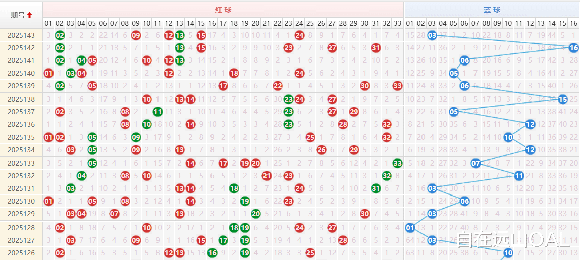 3、蓝球遗漏密码:近 33 期蓝球遗漏 8-15 期的号码回补率达72%,当前蓝球 13(遗漏 22 期)、01(遗漏 12 期)进入高概率回补区间。