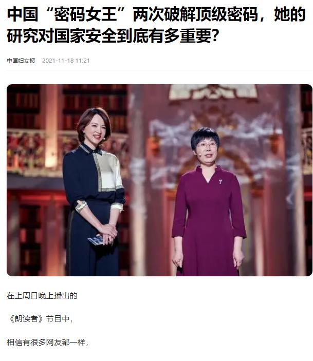 中国妇女报2021年11月18日《中国“密码女王”两次破解顶级密码,她的研究对国家安全到底有多重要?》的报道