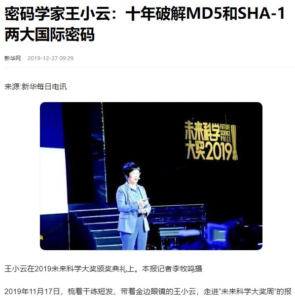 新华网2019年12月27日《密码学家王小云:十年破解MD5和SHA-1两大国际密码》的报道