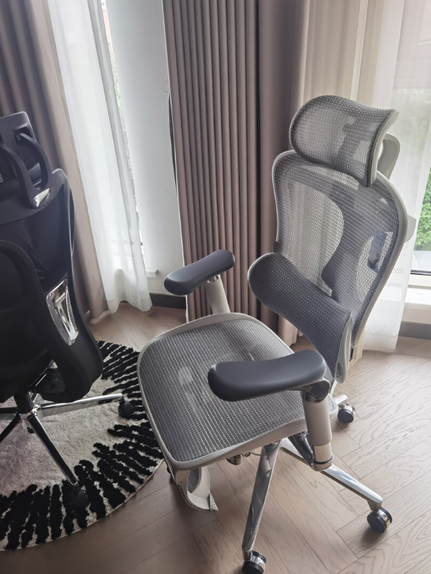 坐上去能明显感觉到椅子的弹性贴合感,换姿势时支撑会马上跟上。头枕是双关节的,颈部不悬空,整体体验轻松、不紧绷。
