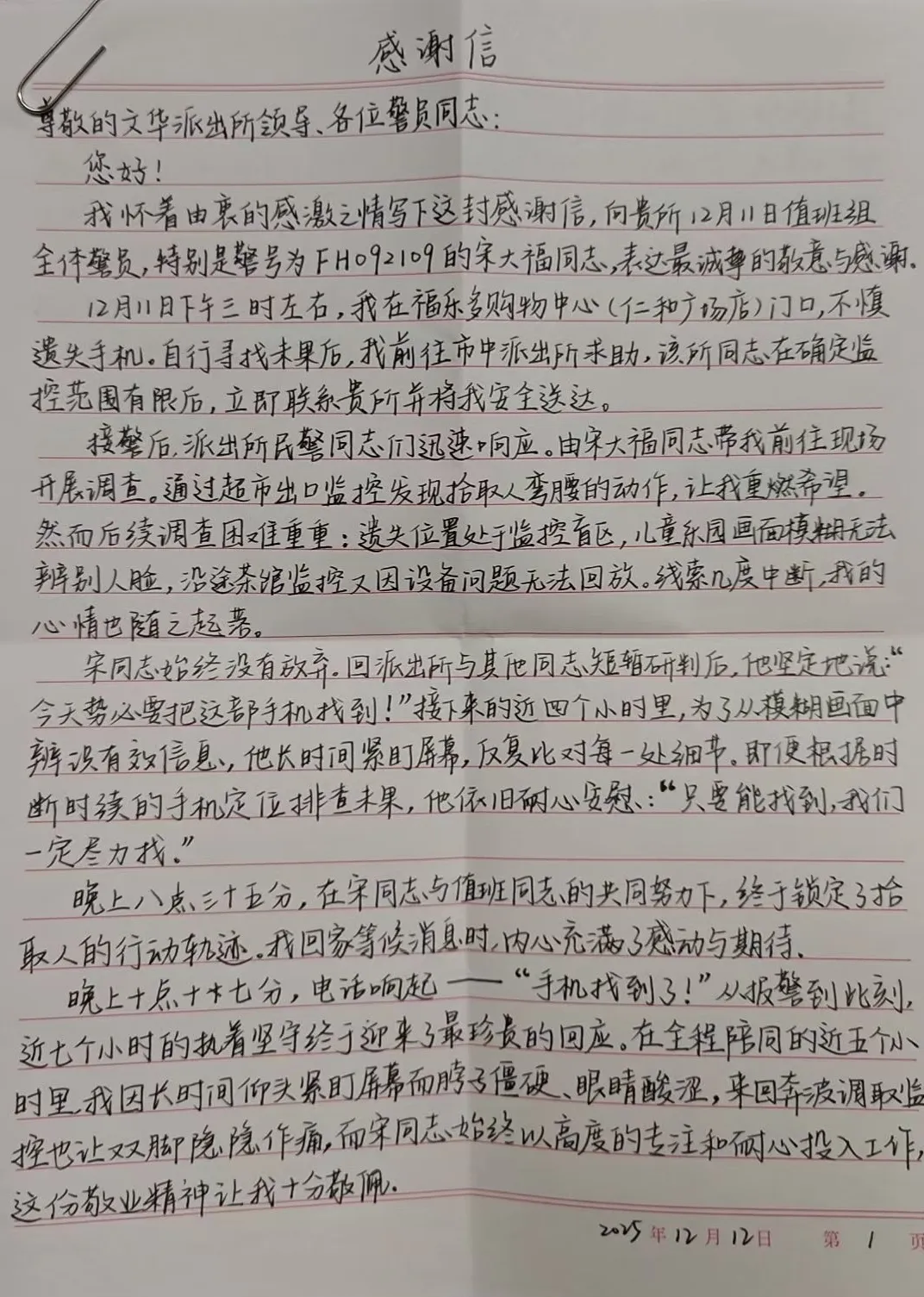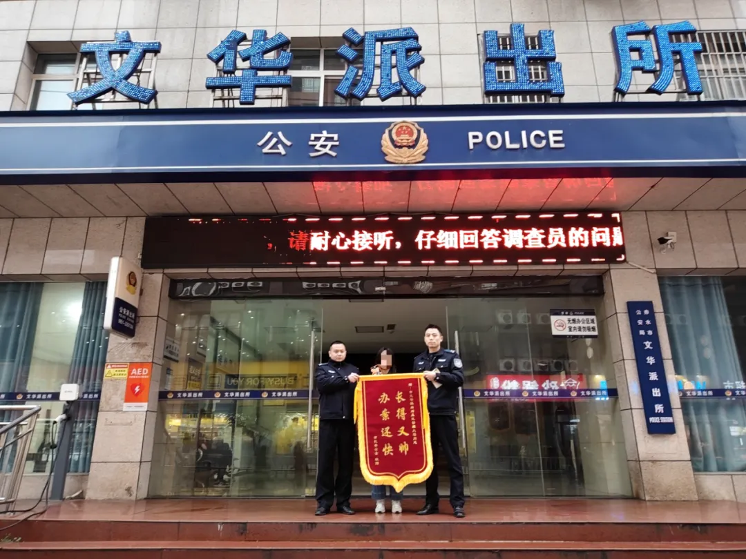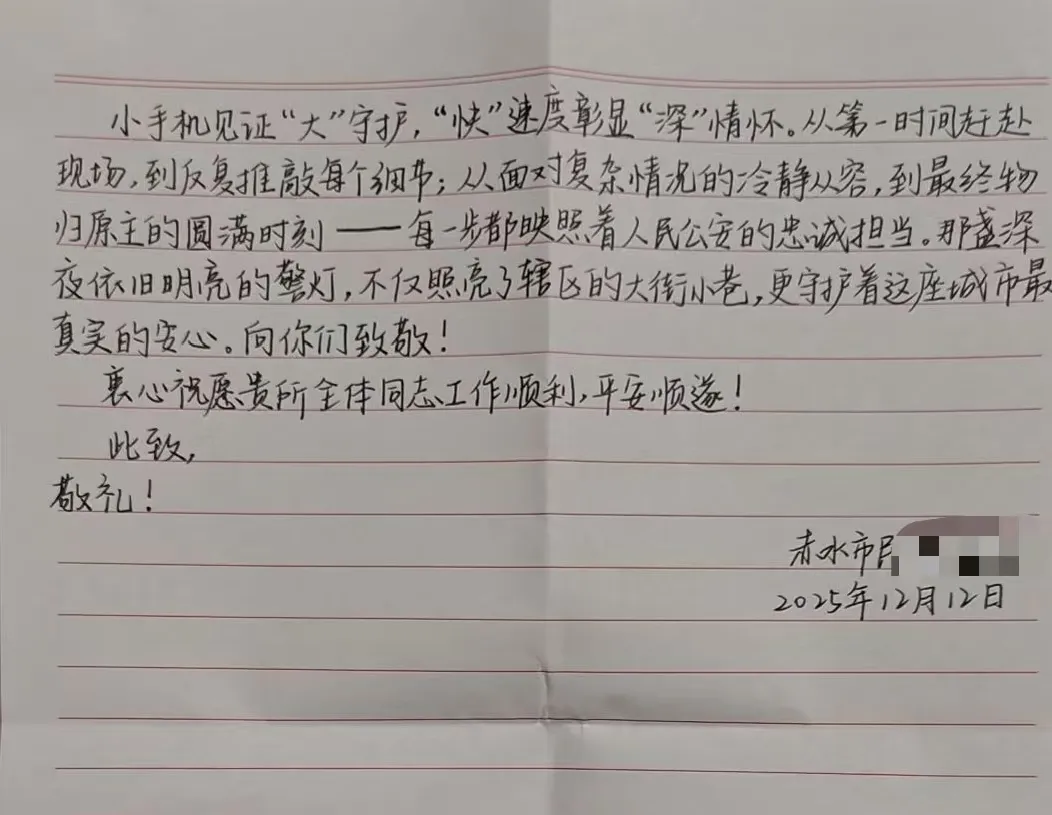 12月16日,赤水市市民查女士将一面绣有“长得又帅 办案还快”的锦旗和一封感谢信,送到赤水市公安局文华派出所民辅警手中,以质朴话语和真挚行动,感谢民警历时7小时,帮其寻回遗失的手机。