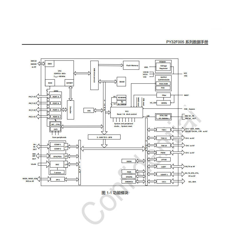 普冉PY32F005搭载32位ARM Cortex-M0+内核,最高主频可达48MHz,可支持复杂的控制算法和实时性较高的数据采集任务。