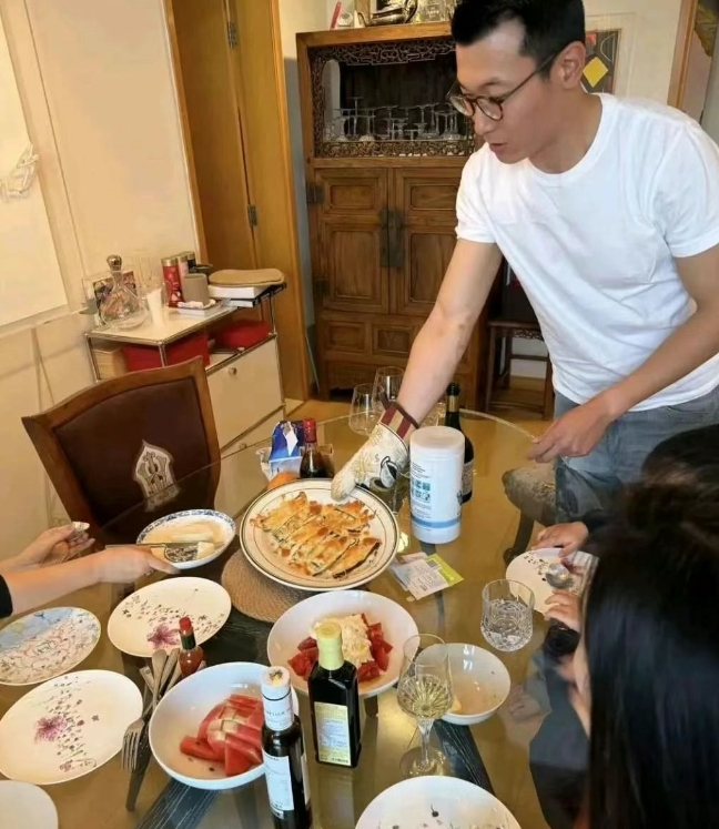 最让人羡慕的是她老公王昀佳,系着围裙在厨房大显身手,四个灶眼同时开工:煎牛排、煮意面、煲浓汤...这架势简直比米其林大厨还专业!谁说帅哥不会做饭?