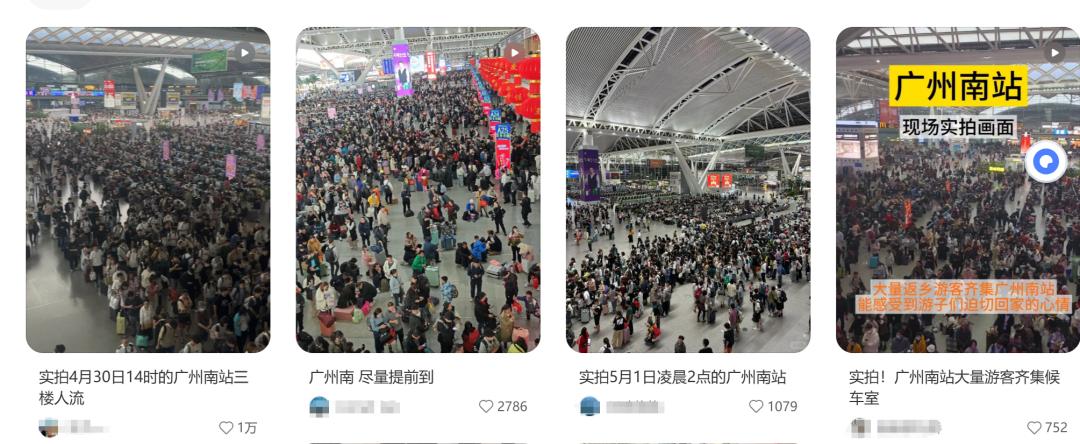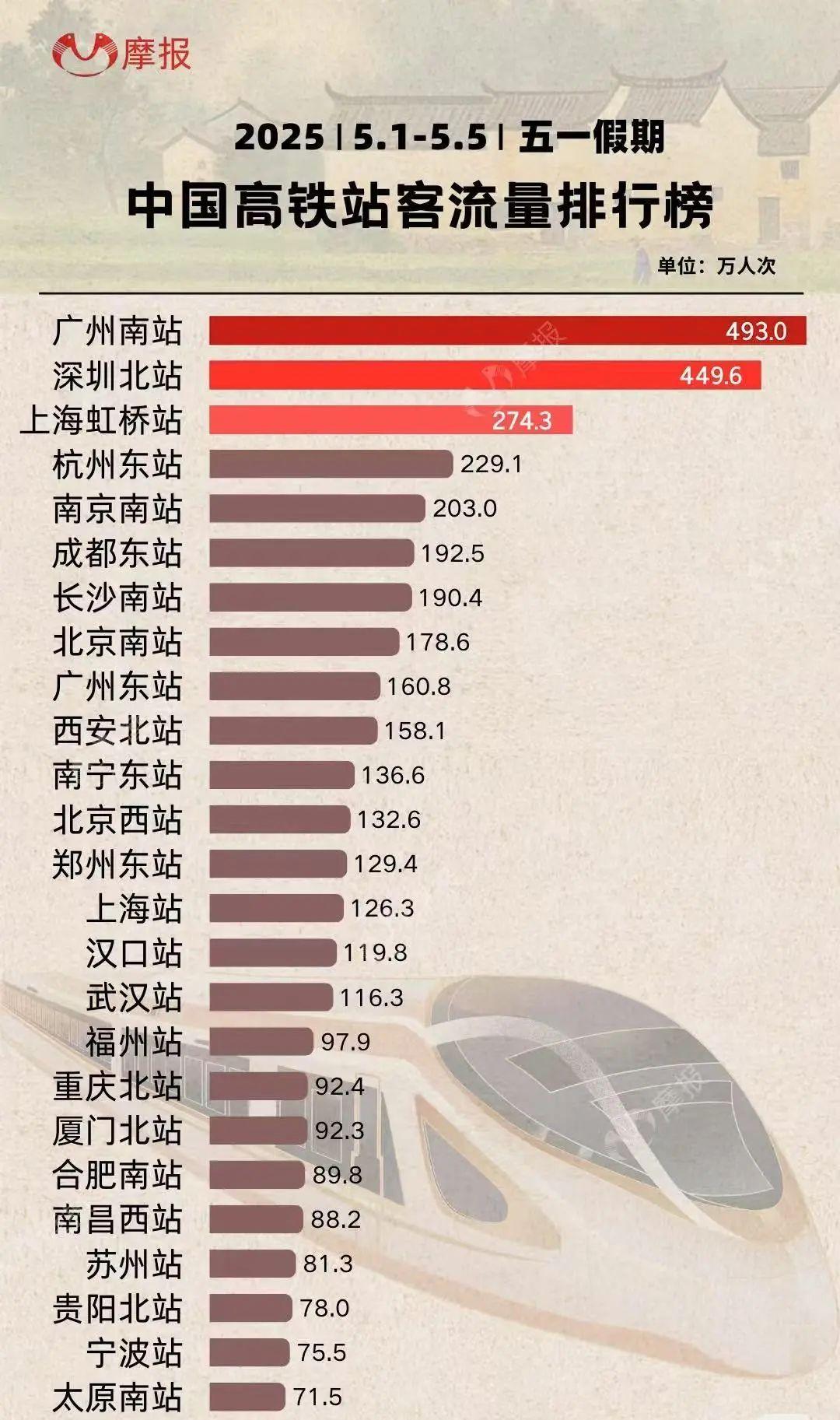在五一假期中国高铁站客流量排名榜里,也并未出现白云站的身影,南站当之无愧地排名第一。