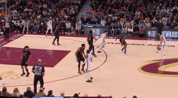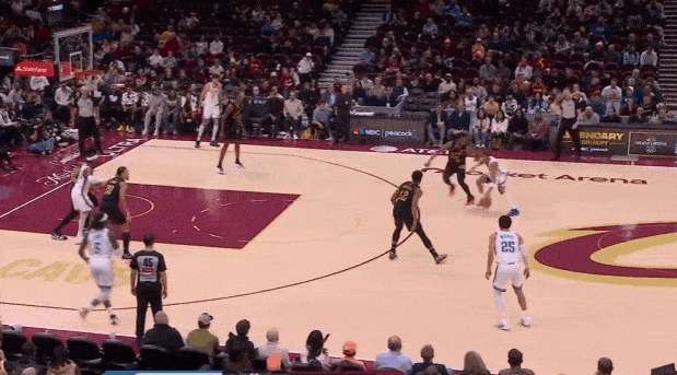 切特和米切尔发动边路挡拆配合,顺下行进间见米切尔突破攻框吸引三人协防上篮不中,立即冲向篮下双手补扣得手。