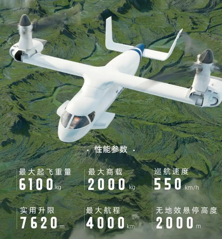 据报道,该款飞机同时具备垂直起降与固定翼高速巡航的优势,拥有卓越的任务适应性与运行效率。该机型最大起飞重量6吨,商载能力达2吨,最大升限7620米,巡航速度可达550公里/小时,航程超过4000公里。