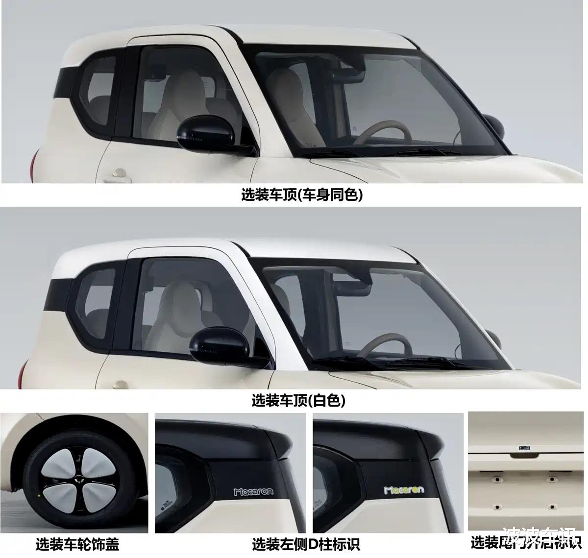 在申报的细节方面,我们可以看到全新宏光MINIEV有白色的车顶可选择,它的C柱上方还有黑色的装饰条点缀,并且采用黑色的后视镜,这样看起来就非常的动感,运动效果比较明显。此外,新车的车轮毂还还有不同样式的装饰,C柱上方还可以选择不同风格的徽标。在车身尺寸方面,全新一代的五菱宏光MINIEV的长宽高分别为3268(3043)/1520/1575(1590)mm,轴距为2190(1965)mm,两门版车型的车身长度相对要短一些。在动力方面,全新宏光MINIEV搭载的是30千瓦的电机,采用的是磷酸铁锂电池组。