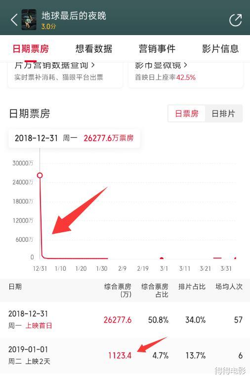 然后电影就瞬间翻车,在中国影史上,开辟了“首映日2亿票房,第二天1000万”的先河。
