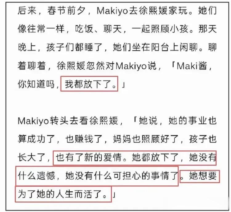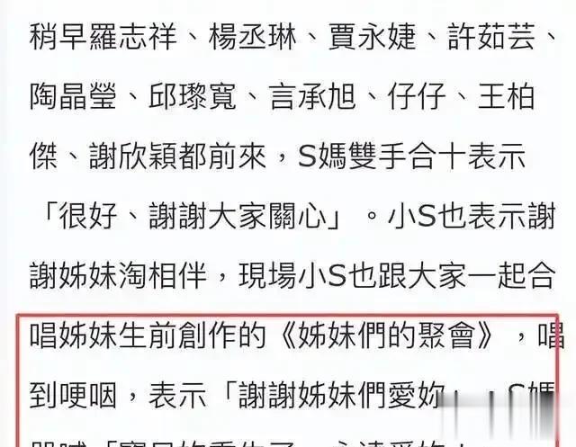 大S生前最后时光的想法也被曝光,她说妈妈也照顾好了,孩子长大了,自己也有新的爱情,表示放下了,也没什么遗憾,也没什么担心的事。