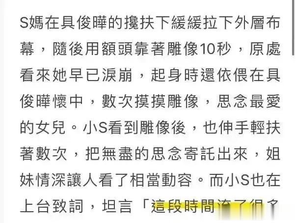 现场正逢大雨,S妈忍不住趴在雕像上痛哭。可以想象白发人送黑发人的痛苦。小S红着眼一直触摸雕像的手,满是不舍。