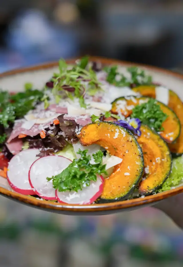 慢烤牛肉南瓜沙拉,作为这个季节的沙拉,很稳的一道。牛肉是真的慢烤,南瓜烤到边缘微焦里面是糯的,吃下去的饱腹感,不像寻常沙拉。