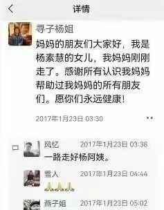 当天晚上,杨素慧的大女儿杨丹发布卜告,她用妈妈的手机在朋友圈发了一段话。