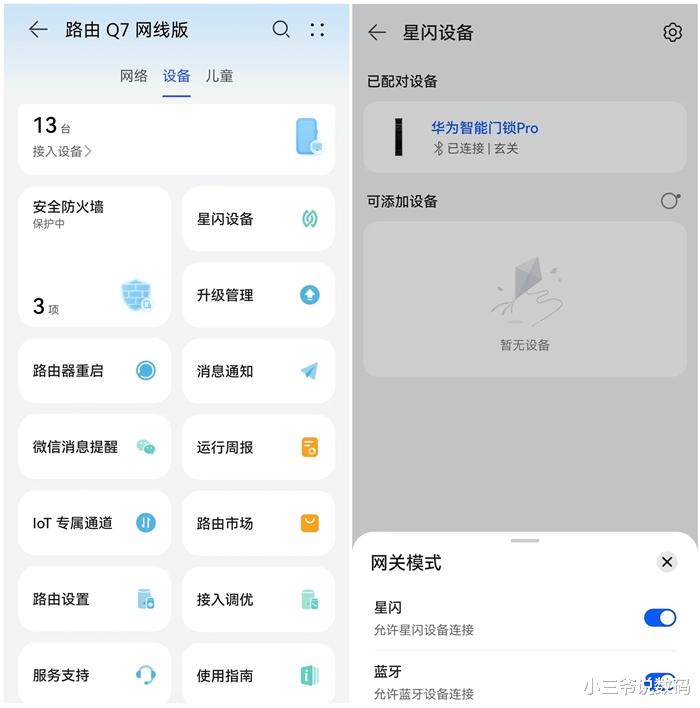 星闪的加入,让华为凌霄子母路由Q7变身鸿蒙智联生态“翻译官”,将不同通信协议的智能设备接入同一网络,实现统一管理和控制,相比于传统的蓝牙网关,星闪的连接速度更快、覆盖范围更广、抗干扰能力更强、功耗更低,我们要做的,只是打开智慧生活APP,一键添加家中的鸿蒙智联设备即可。