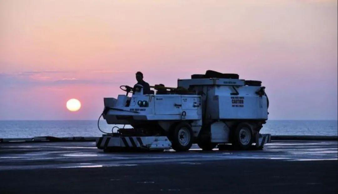 (美国航母上专门配备的一台甲板清洁车,每天都要把甲板清洁一遍。)