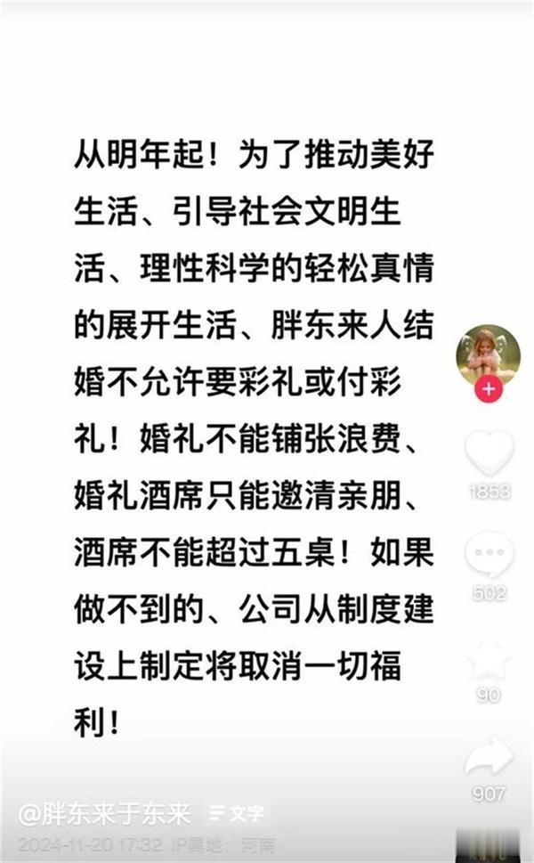 从明年起,为了推动美好生活、引导社会文明生活……胖东来人结婚不允许要彩礼或付彩礼!婚礼不能铺张浪费,婚礼酒席只能邀请亲朋酒席不能超过五桌!