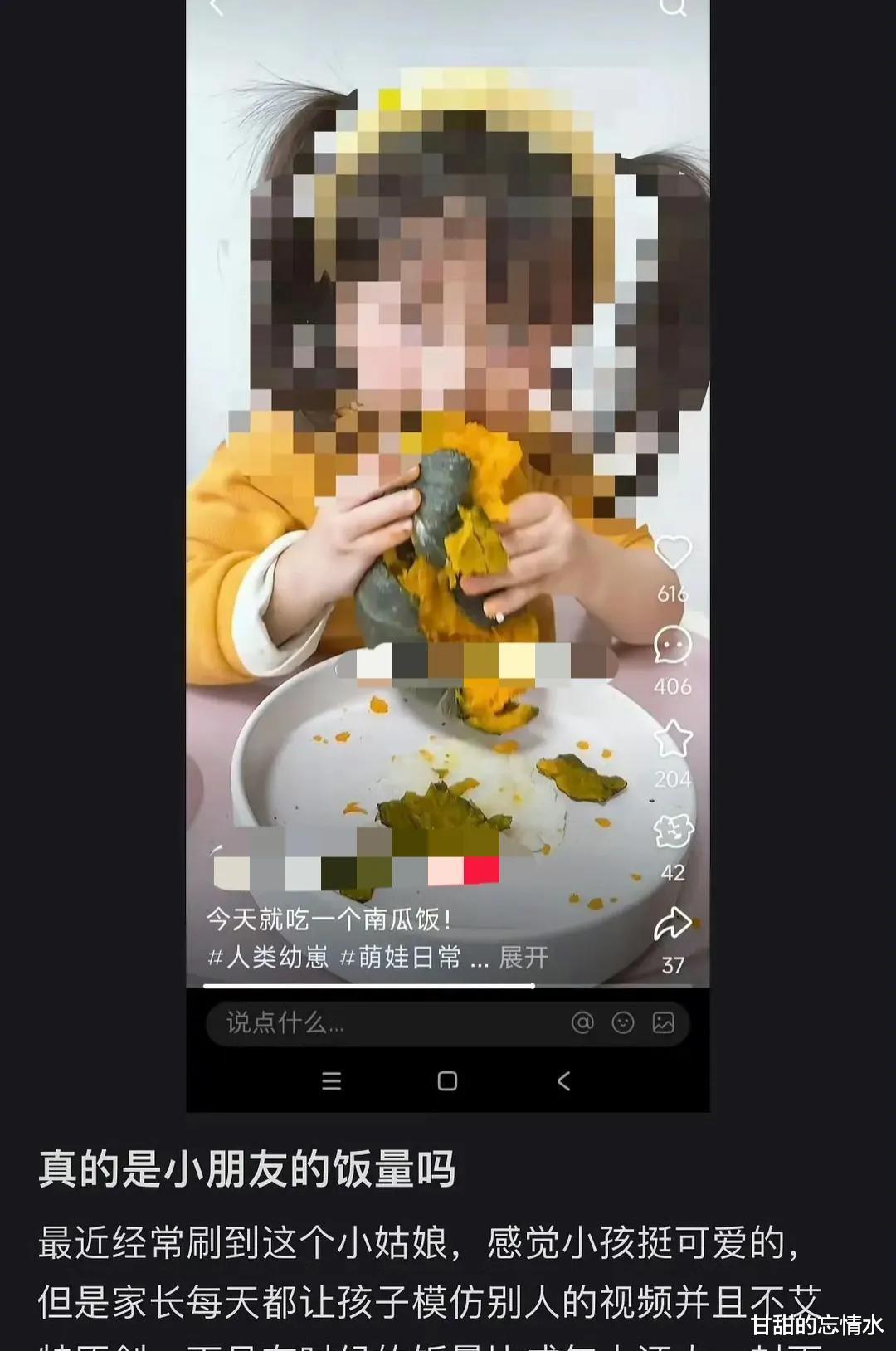 视频里的画面,让人看了实在揪心。小小的女孩,被父母逼着吃下大量的食物,无论是香甜的大饼、饱满的哈密瓜,还是金黄的南瓜,在她小小的嘴里,都显得那么巨大。她吃得狼吞虎咽,却始终不敢抬头看镜头,只会小心翼翼地观察着父母的脸色,生怕自己吃得不够快,不够多。这哪里是享受美食,分明是承受着巨大的压力和恐惧! 这根本不是一个三岁孩子应该有的模样,更像是一个被训练出来的“赚钱机器”。