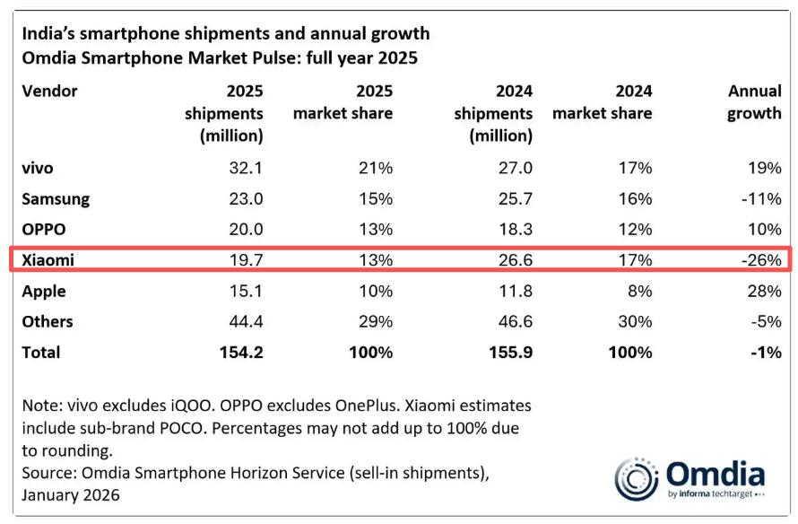 上图是2025年的数据,可以看到小米已经下滑至第4名了,跌了26%,而VIVO在2025年登顶了,三星排在第二名,OPPO是第三名。