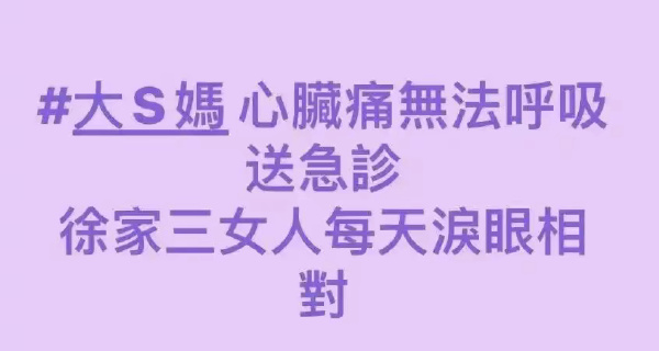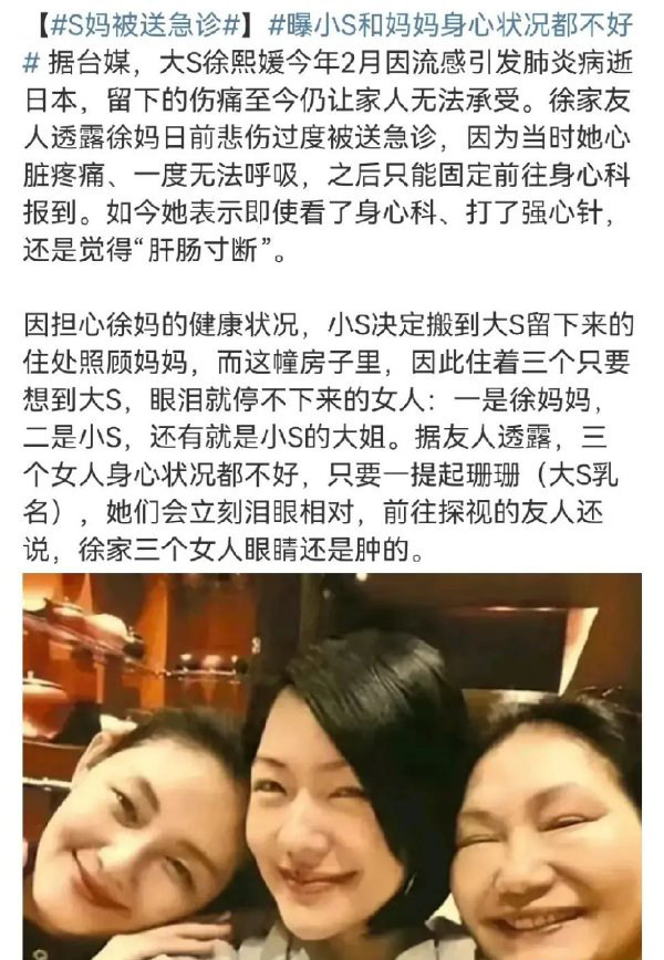 小S家又上热搜了,不过这次可不是她又在节目里放飞自我,而是她妈妈被送急诊了。据说是因为悲伤过度。大家都知道,大S徐熙媛今年 2 月因为流感引发肺炎在日本病逝,这事儿当时就让整个娱乐圈都震惊了。大 S 可是娱乐圈的知名人物,她这一走,留下的伤痛可不是一时半会儿能过去的。小 S 和她妈妈徐妈,那可都是深受打击。徐妈更是悲伤过度,身体和心理都承受不了。