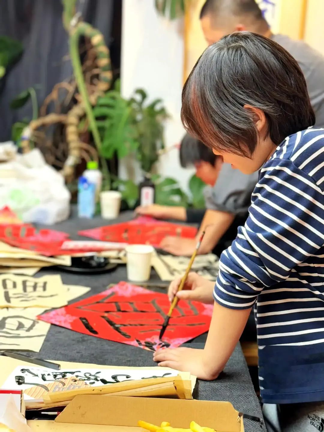 只见在这张照片中,嘟嘟穿着黑色外套,扎着小辫子正在写着一个大的“福”字。