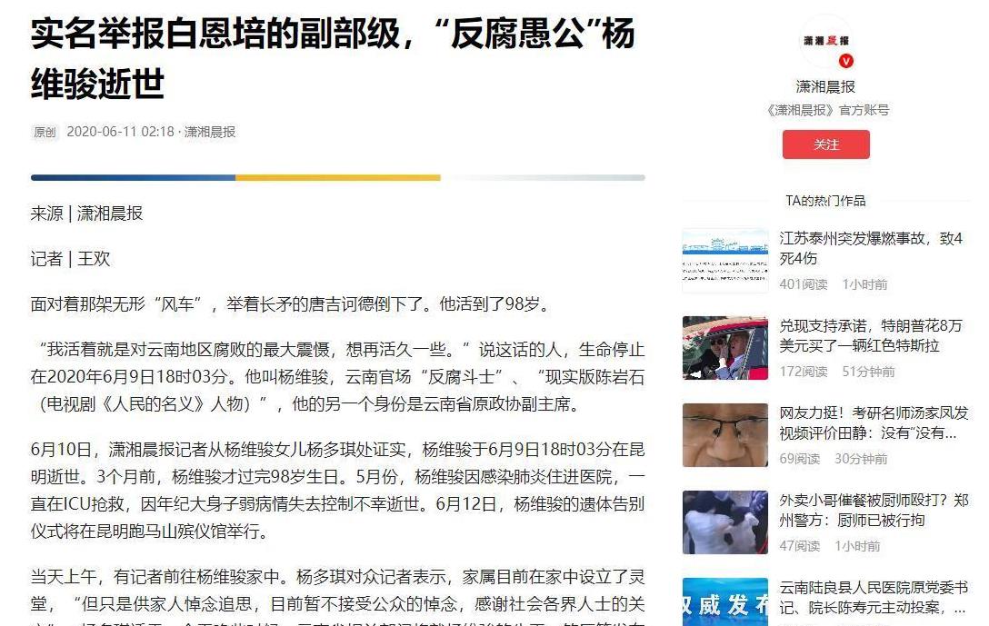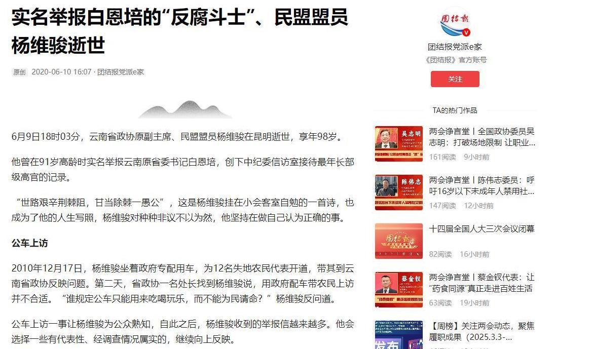 杨维骏以无畏之姿进行实名举报,在中纪委信访档案上书写了三项空前纪录:举报者年岁最高、职位最尊,且全然摒弃个人私益,只为民众疾苦代言。凭借其不懈的坚守,正义之光终得照耀,使得贪腐之徒得到了法律应有的制裁。2020年6月9日,昆明传来消息,资深干部杨维骏因病逝世,终年98岁,他的一生跨越了近一个世纪之久。