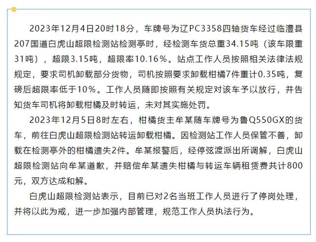 通报中还称货主在橘子丢失后报警,经过派出所调解,超限站向货主道歉,并赔偿橘子和转运车辆租赁费共计800元,双方已经达成和解。