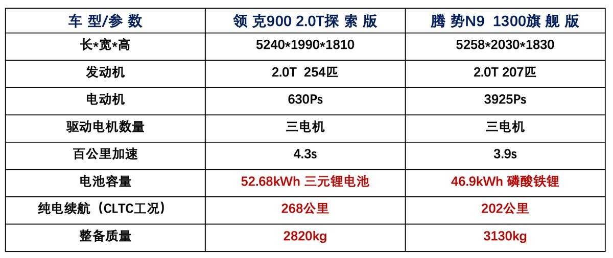 领克900让喜欢大型SUV的用户有了更具性价比的选择,尽管入门车型是搭载1.5T发动机的插电混动,但得益于3DHT,百公里加速也仅有4.8s,只比腾势N9慢了0.9s,但价格却低了近6万元。在配置上辆车各有亮点,但总体上大差不大,悬挂软硬可调、高速+城市NOA、激光雷达、电吸门等等,而腾势N9的亮点是标配三电机(领克900顶配配三电机)、坦克转弯、悬挂高低可调,而领克900亮点是三元锂电池、更长的续航、更好的智能座舱、第三排座椅的加热按摩等。领克900与腾势N9旗舰版相比,配置基本趋同,但是价格却低了1.5万元。