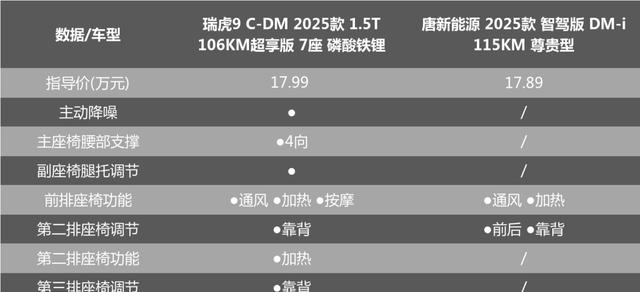 另外一个不可忽视的影响因素是座椅配置的舒适性。对于家庭用车,尤其是在长途旅行中,舒适的乘坐环境尤为重要。奇瑞瑞虎9 C-DM提供了更为豪华的座椅设计,主驾驶座不仅支持加热、通风,还有按摩功能,而副驾驶则配备被称为“零重力女王座椅”的设计。相比之下,比亚迪唐DM-i的座椅功能略显简单,仅提供基本的加热和通风。
