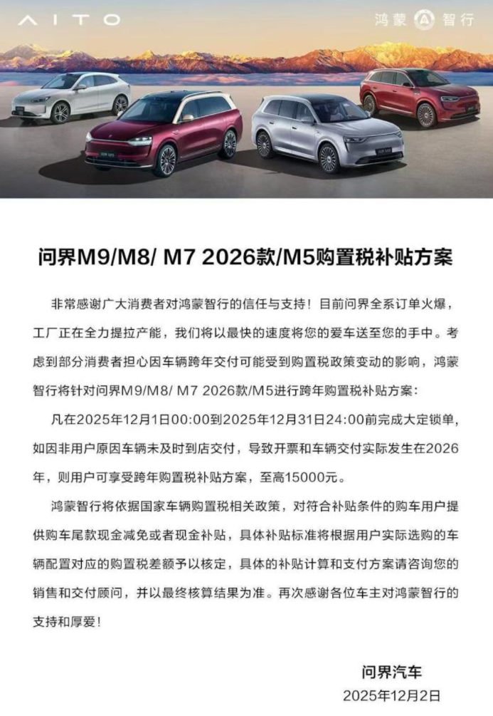 时值岁末,车市将迎来又一波购车热潮,购置税全免政策也进入收官倒计时。为进一步优化消费者购车体验,12月2日,问界汽车针对问界M9/问界M8/问界M7 2026款/问界M5推出了极具诚意的跨年购置税补贴方案:即日起至2025年12月31日24:00前完成大定锁单,如因非用户原因车辆未及时到店交付,导致开票和车辆交付实际发生在2026年,则用户可享受至高15000元跨年购置税补贴方案。该补贴将以购车尾款减免或现金补贴形式发放,具体补贴标准将根据用户实际选购的车辆配置对应的购置税差额予以核定。