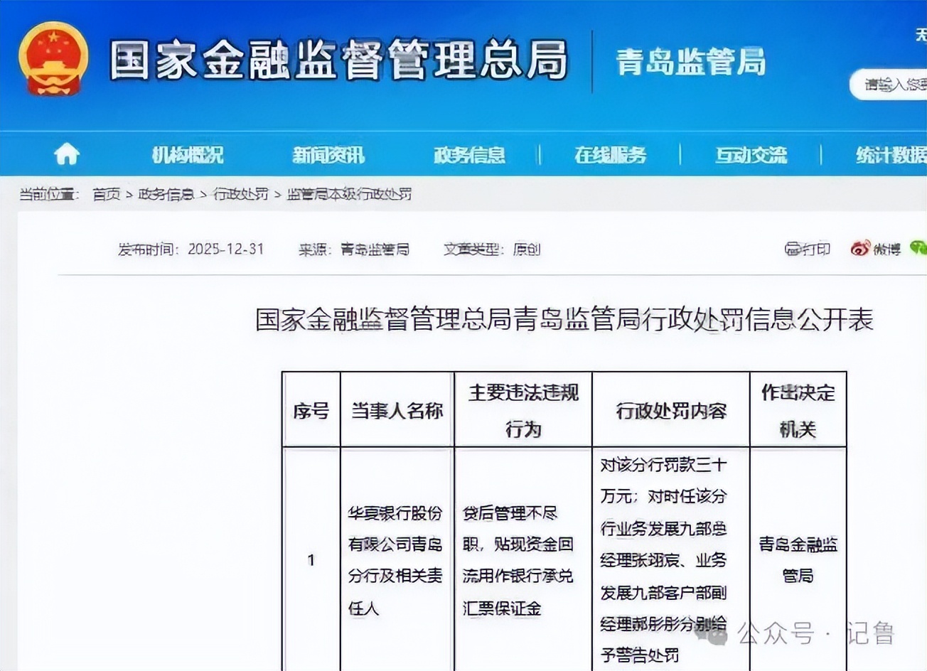 先给不了解的朋友划重点:2025 年最后一天,青岛监管局一纸罚单砸向华夏银行青岛分行 —— 贷后管理马马虎虎,贴现资金居然回流去当银行承兑汇票保证金,直接罚款 30 万!更有意思的是,业务发展九部的正副经理双双领警告,这锅算是实打实地扣在了执行人头上。
