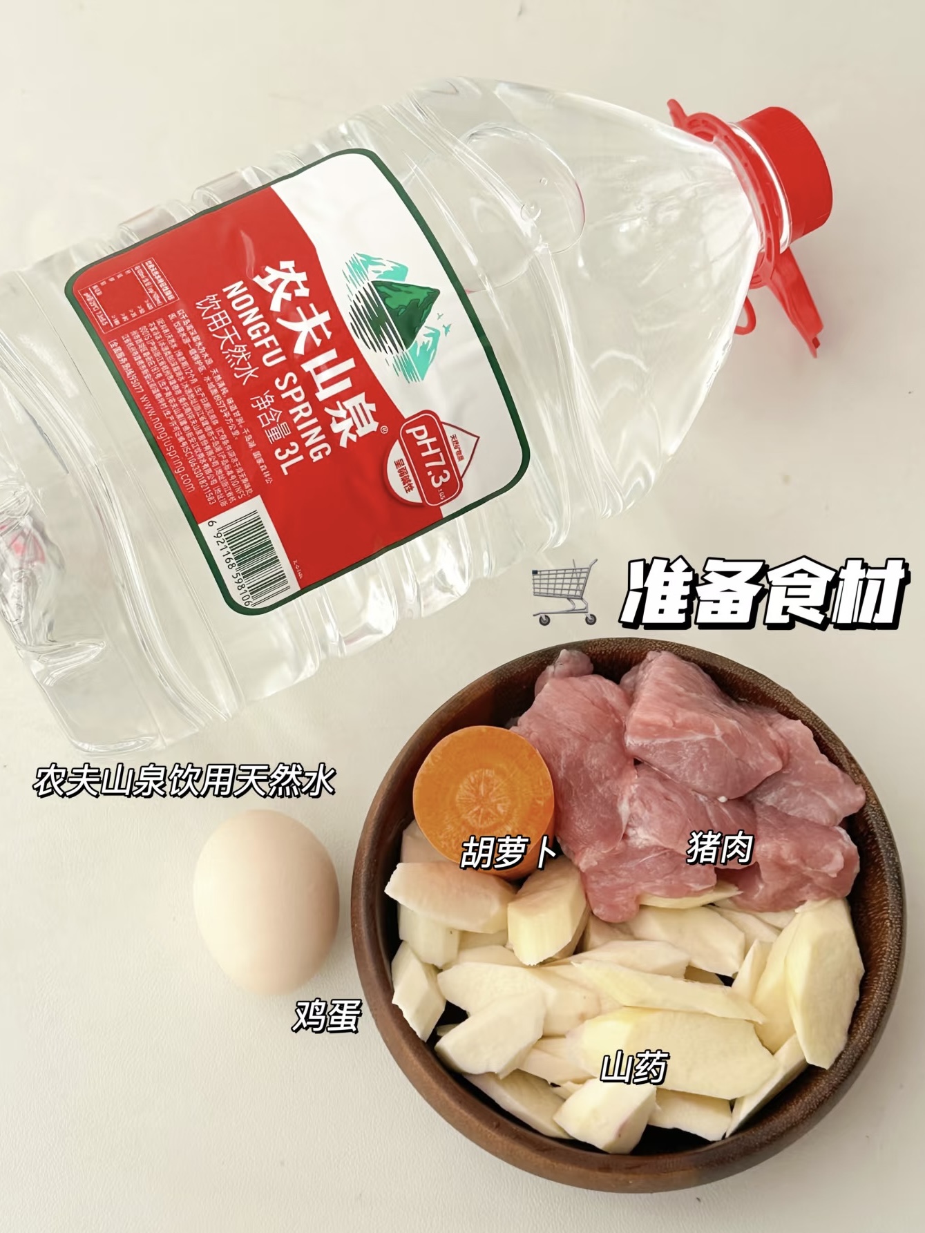 先把“地基”打好:山药挑脆不挑面,粗粗短短、毛须旺盛的才够鲜;猪肉选梅花或前腿,二八肥瘦,打碎后不会柴。关键秘密水——农夫山泉3L装,别心疼,好水才能出奶白汤。配角们:胡萝卜一小截负责调色,鸡蛋一颗负责“飘金花”,生姜两片去腥,再抓点淀粉和酱油,就能把肉香锁成“小炸弹”。