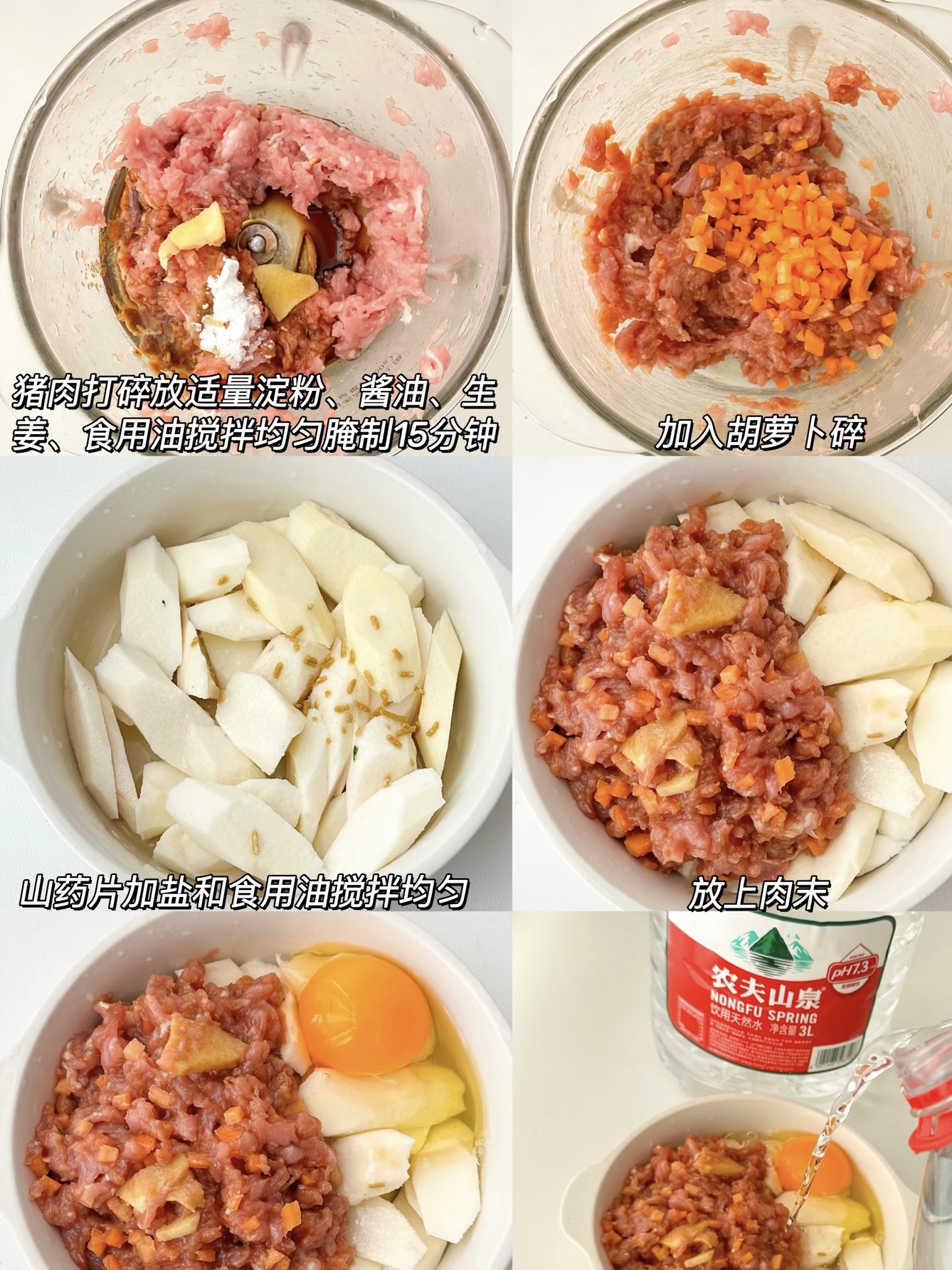 猪肉末里加入1勺酱油、半勺油、1撮姜末、1小勺淀粉,顺时针搅到发黏,静置15分钟——这叫“腌个灵魂”。胡萝卜切碎碎,像橙色小雪粒,倒进肉末里一起搅,颜色瞬间“活”了。山药去皮记得戴手套,不然手痒到怀疑人生;斜刀切成“小飞机翼”,厚度3毫米,既薄到快熟,又厚到脆爽。拿碗给山药“洗个盐水澡”,滴两滴油,防黑又提亮,拌一拌它们就乖乖待命。
