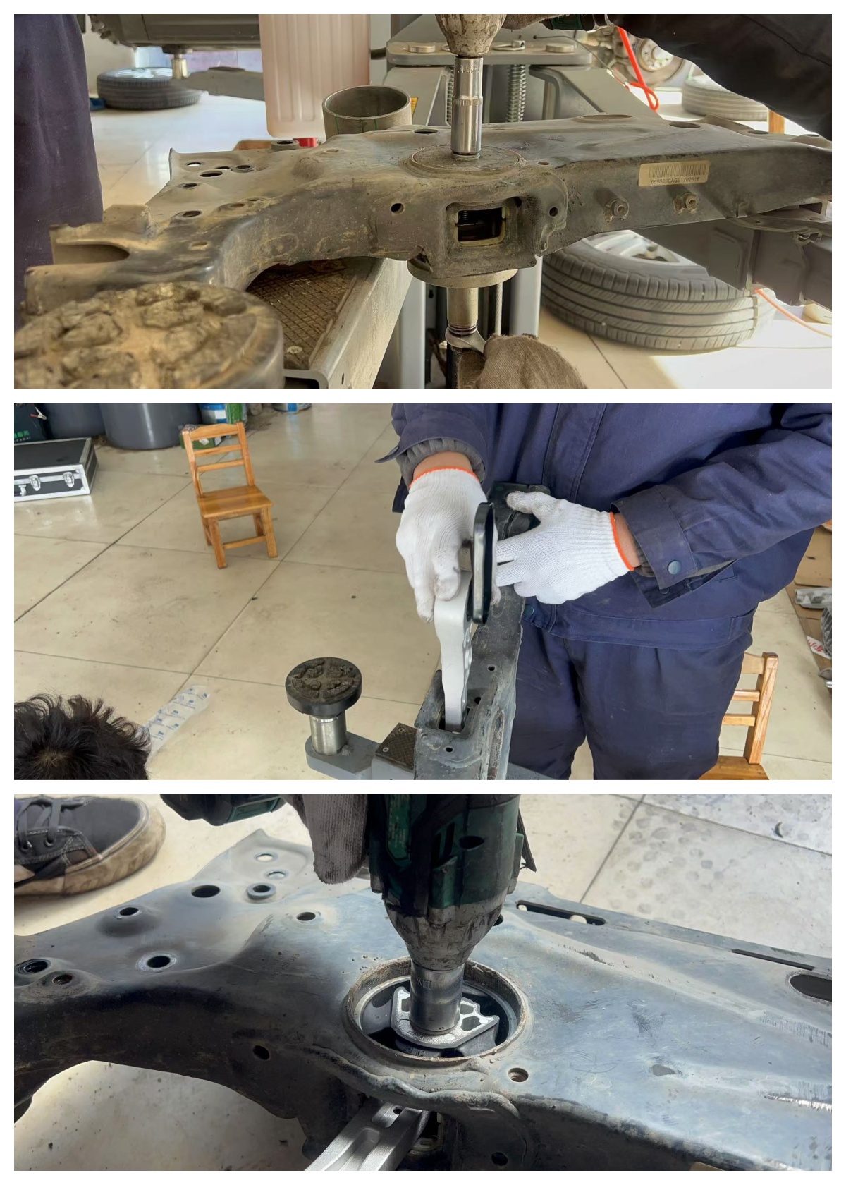 时间就像R沟,挤挤总是有的!看你怎么充分利用碎片时间了。那边在做清洗,我们这边赶紧收拾底盘!小哥麻利的更换元宝梁衬套……