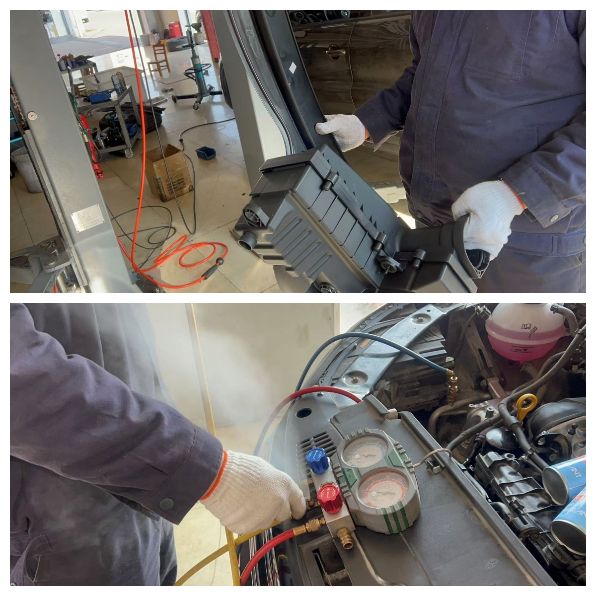 加注冷媒R134,同时更换破损的空气滤芯外壳,还是那句话,要讲究!