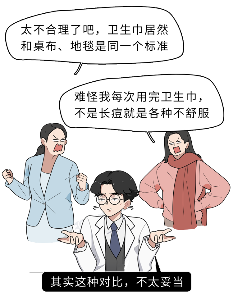 因为不是所有的纺织产品都适用于《国家纺织产品基本安全技术规范》这一标准,卫生巾就是个例外,它执行的是上面说的GB/T 8939-2018卫生巾(护垫)标准,把不同标准体系下的两个东西放在一起对比,似乎不太合理。