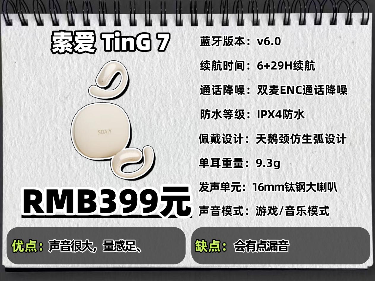 在佩戴设计上花了不少心思。它采用天鹅颈仿生弧设计,结合7.7克的轻量化和内部硬胶支撑结构,兼顾了轻盈体感与稳固贴合,长时间佩戴也无明显压迫感。音质是其另一大亮点。耳机搭载16mm钛钢大喇叭,配合专门调校的低频增益算法,使得声音尤其是低频表现扎实有力。同时,它支持LDAC高清音频编码,能够呈现更多音乐细节,满足对音质有要求的用户。在实用功能上,TinG 7 配备了蓝牙V6.0,连接更稳、功耗更低。双麦通话降噪能有效提升通话清晰度。此外,它还拥有IPX4级防水和6+29小时的综合续航,从通勤到运动,都能可靠陪伴。