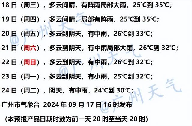 9月19日-20日,中南部市县多云,有(雷)阵雨,局部暴雨,其余市县多云,局部有(雷)阵雨。雷雨时局地伴有8级左右短时大风。最高气温:中北部市县34~36℃,其余市县32~34℃。