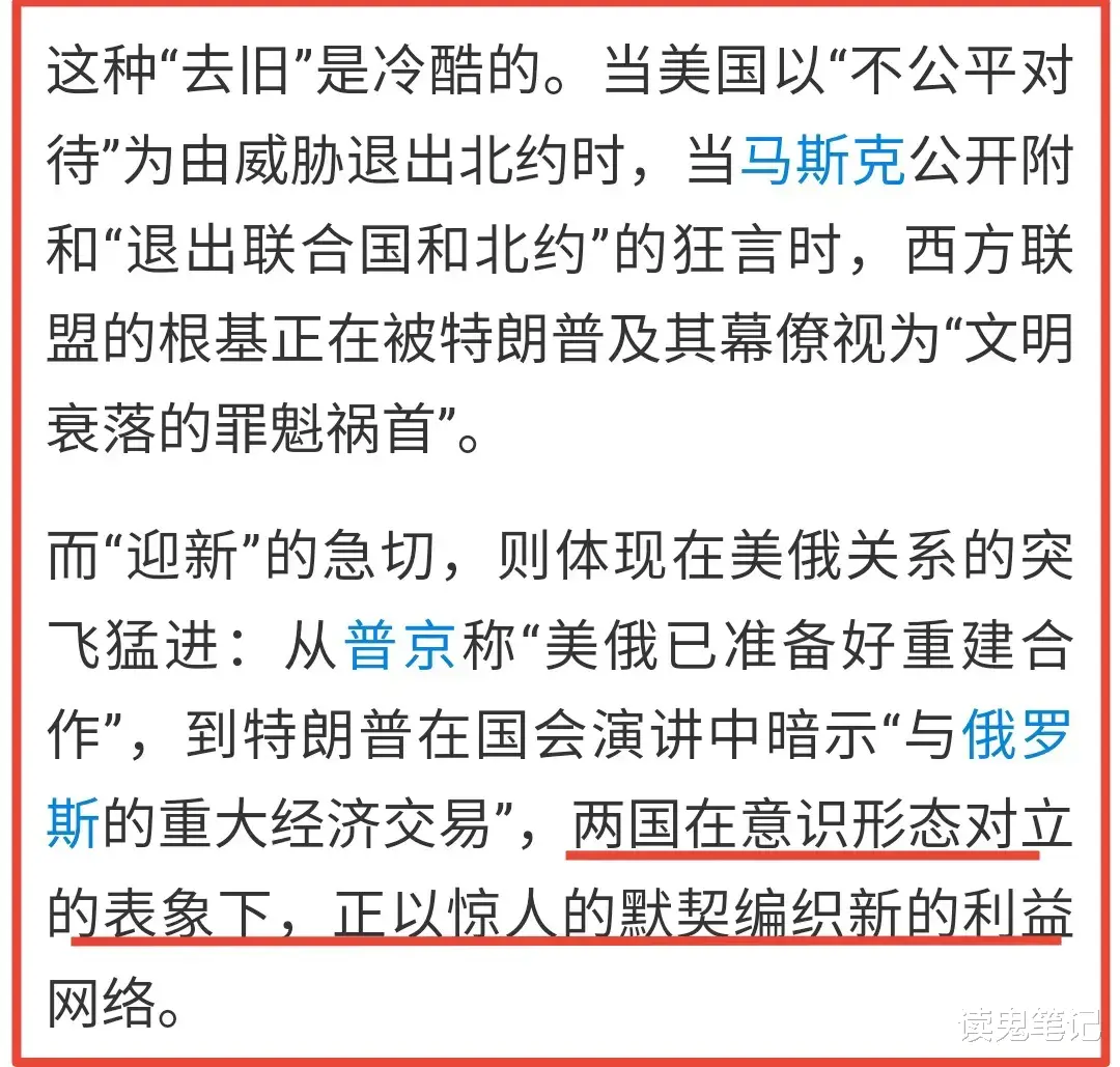 我没查到《美俄轴心:世界格局由此大变》的原文,却查到一篇标题类似的文章,题为《美俄轴心:“双普”联盟,重置世界秩序》。标题意思基本一样。