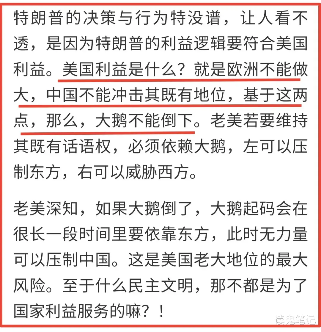 在法经网那篇文章里,说美国有两个利益,其中之一是不能让欧洲做大。这样说是对的。然而文章又说,“基于这两点,大鹅不能倒下”,说美国依赖大鹅。这就有问题了。美国威胁欧洲,策略不是联俄,而是反俄。