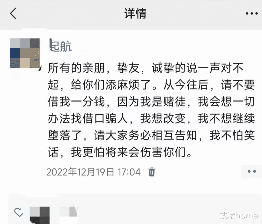 百分之99的赌徒,都十分看重名声。不能逾期,父母会难过,不能被催收,否则失去工作,作为过来人,我觉得很可笑。我与多数赌徒不同,我只坦白一次,因为我发现比债务更严重的其实就是赌瘾。曾经我是一个极其自律的人,每天6点起床慢跑40分钟,然后回家冲个热水澡换身衣服上班,这习惯坚持多年,我自信的认为凭借这份毅力,就没有克服不了的问题。直到后来沉迷上网赌,深深陷进去难以自拔,我才知道毅力在赌瘾面前不值一提。自从赌了,一切的生活习惯都发生改变,早晨也不去跑步了,精神极度紧张,睡眠质量也每况愈下,曾热衷的娱乐也变得索然无味,像健身、登山、网游、以及吃火锅勾不起我任何欲望。我每天上班想着赌,午休、下班、躺床上、上厕所都是手机不离手,对着那六寸大小的屏幕呐喊闲、闲,让我赢一把求你了...我像精神病一样,自言自语,嘴里时不时说出几句骂人的脏话。一天不赌,浑身难受,辗转反侧,就是无法入睡,不赌一把像是死不瞑目一样。我特别注重自身信誉,更在乎名声,为了续命,也为了网贷不逾期,我宁可用高额利息滋养那些吸血巨兽(网贷),也不想催收爆通讯录。开始以贷养贷,后来贷无可贷,然后突破底线,说了人生当中第一句谎话去骗人,哪成想到谎话说了第一句,后面就滋生无数句。我渐渐的成为人形怪物,虽人模人样,但内心深处早已是魔鬼一样。我平时特别注意个人卫生,也在乎个人形象,早中晚都刷牙三次,每天洗澡刮胡子,赌了以后,卫生、形象都统统不在乎,不喜爱出门,蓬头垢面,胡子不刮,牙也不刷,不反省自身问题,反而怨恨老婆小题大做,经常发生激烈争吵,摔东西、砸电视,气急败坏的甩自己耳光,想用这样的方法结束争吵。那段时间我过的很累,如背上扛起大山、喘不过气,幽灵在脑袋里晃悠,像陷阱里的兔子,被绳索勒脖子,让我快要窒息。我的生活如乌云遮住阳光,庞大的债务,睁眼闭眼都是账单数字在眼前跳跃,有时候连母亲关怀的电话都草草挂断,生怕哽咽声暴露脆弱。在2022年12月份的时候,我鼓起勇气,把积压已久想说不敢说的丑陋经历全部跟家人坦白。为什么坦白?因为我不想那么累了,更不想每天套上枷锁,明明千疮百孔还要装作没事人一样,我不想演,我太累了。父母拿出12万,我首先把紧急的网贷应付上,唯独留留着花呗故意不还,之后经过老婆同意,我们把唯一的住房给卖了94万,彻底上岸。包括亲戚的债务也都全部还清,虽然明面上债务没有了,但实际上赌博造成的损失却是依旧存在。还清债务还有几十万的卖房尾款我全部交给老婆,而且对她说要不离婚吧,因为我对自己不够自信。经历过网赌的可怕,我也不再相信自己,但我老婆执意要给我机会,为了将复赌的可能性彻底毁灭,我用了三个方法,因为只有这两个方法才能让我彻底戒掉。第一个方法,我发朋友圈,虽然我很在乎名誉,但我更怕赌瘾。说句大家都没想过的话题,明天你会想什么今天你知道吗?今天你如此肯定,说不定明天就松懈了?不赌的人尚且如此,更合乎赌瘾成性的人,拿什么来信誓旦旦肯定你就一定可以戒赌?所以第一步,我就切断与外界借钱的可能性。其实微信里很多客户、以及朋友,名誉人设是很重要,在朋友圈发这些会影响我的口碑,但不这样,将来或许我会害了他们,更害了自己,为了不想让他们成为原告,我成为被告,哪怕会失业,会丢去工作我也在所不惜,所以朋友圈那句话很有必要发,发出去之后首先我没脸继续再借,其次就算我去借,别人也不愿意借。第二个方法,砍断征信。除了花呗之外,其他的网贷我全部逾期,因为征信是互通的,只要逾期一家,其余都不能再借,我不是没能力还,房子卖掉老婆手里还有几十万,而且花呗只是逾期了32000,在此之前我咨询过律师,逾期2年顶多会告我,等他告我的时候我协商还款也同样来得及,主要的目的是预防今后的自己脑子一热又去借网贷,有时候趁着清醒的时候做一些清醒的事情,总比相信未来的自己可靠一些。第三个方法,工资转移。老婆给我开通了亲情卡,平时所有工资我全部上交,家里有人情往来全部让老婆处理,我只负责赚钱,其余的一概不管,所以从22年的12月之后,一直持续至今,我的工资全部上交了,目前以老婆名义重新按揭了一套房,虽然房子面积没有以前大了,但起码也有个家了。不瞒大家,现在我想借一分钱都借不出来,因为征信仍然还是黑户,虽然花呗去年已经协商全额还清,但征信毕竟是五年时间才能恢复。老哥们我说句话大家别生气,千万别认为自己很可靠,可靠的是当下,明天的你是否可靠没人知道,不要想着还清债务就结束,如果你做不到我所说的三点,那我建议你最好不要坦白,这样只会拉着全家人陪葬。我们始终都要清楚的明白是什么让你如此难堪?是什么让你三观变异?又是什么让你穷困潦倒?我告诉你,一切都是赌瘾,它才是最大的祸害。你要解决的从来不是债务,你要解决的是赌瘾,不要只想着解决眼下的债务就认为太平了,后面一旦遇到工作不顺、心情不好、你照样会重蹈覆辙,听我一句劝老哥们,先把咱们的病治好,我一直看这个公众号,如果你不想被人嘲笑,怒骂你是一只“赌狗”,就赶紧戒赌。只要有能力,名誉没了又怎么样?征信坏了又怎么样?想贷款买车买房,我用老婆身份,要么就是全款付清,亲戚朋友如何看待过去我是赌徒又能怎么样?我又不吃别人家一粒米,更不会借一分钱,所以戒赌吧,这才是