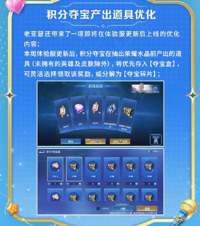 积分夺宝即将迎来一波重量级的优化,目前还在体验服中测试。凡是积分夺宝产出的道具,均会存入夺宝盒,可以自己选择领取道具或者分解为夺宝碎片。