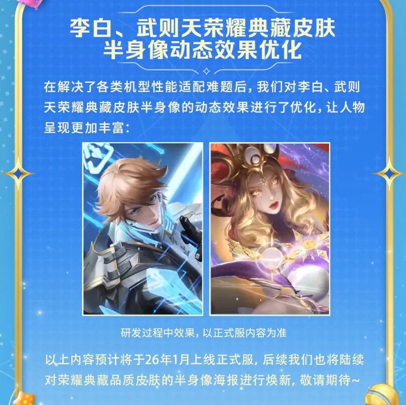 自2021年5月份王者荣耀提出典藏皮肤的至尊封面之后,就一直没有声音。而现在,终于端上来了。首次推出的是李白鸣剑曳影和武则天倪克斯神谕,预计2026年1月份上线正式服。如果反响不错,其他的典藏皮肤也会慢慢优化。