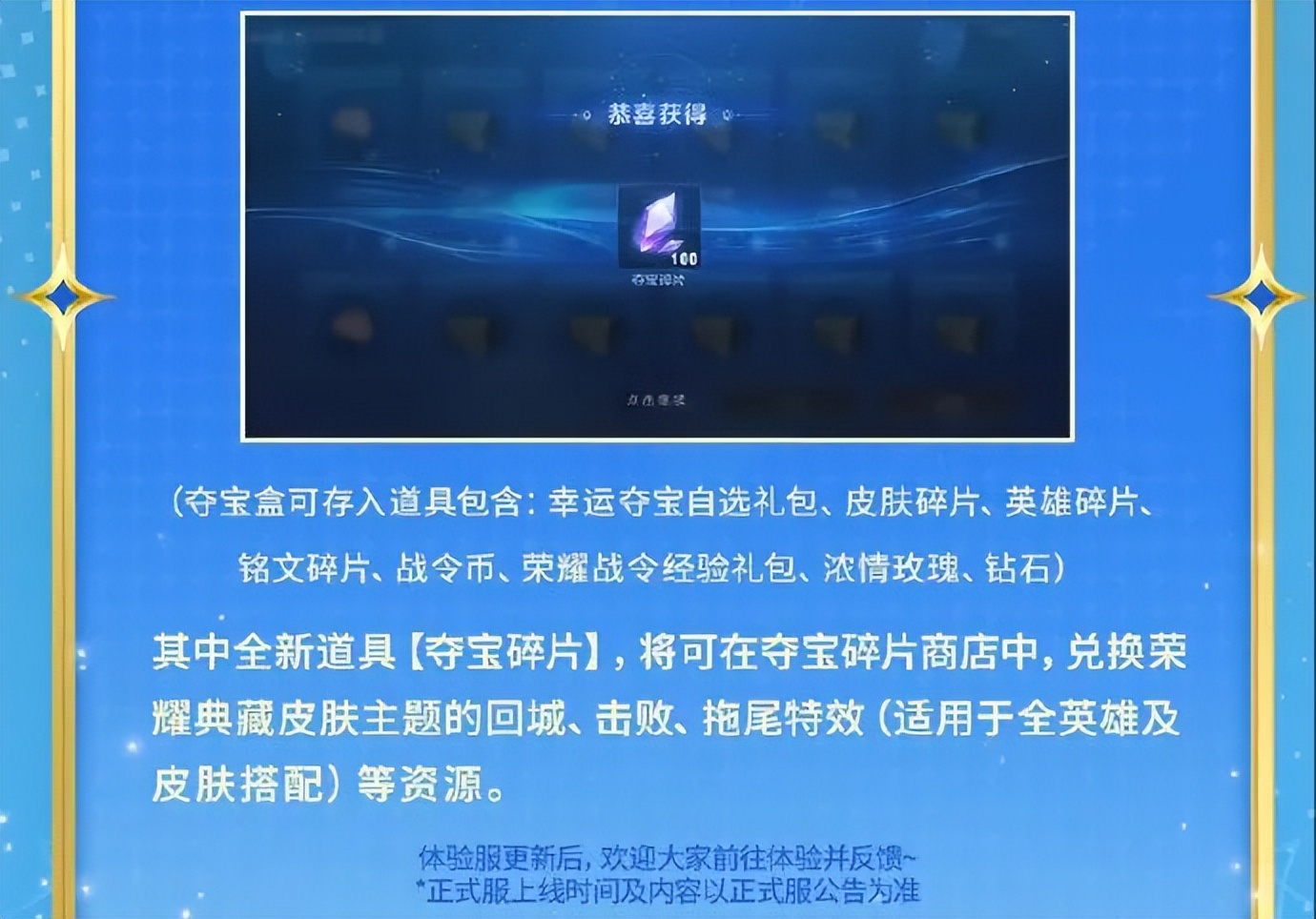 夺宝碎片可以用来兑换荣耀典藏皮肤的回城、击败、拖尾特效等。这是给大家多了一个选择,也可以防止资源溢出严重。但如果这回城、击败、拖尾没有及时更新,还是会有溢出问题。