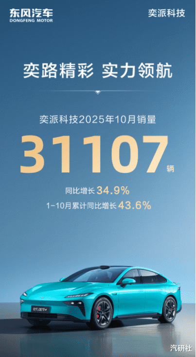 就在这样的白热化竞争中,奕派科技交出了一份反差强烈的成绩单:10月销量31107辆,同比增长34.9%;1-10月累计销量同比增幅更高达43.6%,远超行业平均水准。更值得关注的是其增长节奏——从7月27923辆到10月31107辆,三个月环比增长11.4%,在“金九银十”的关键窗口期,奕派科技增速是主流新势力的2-3倍。
