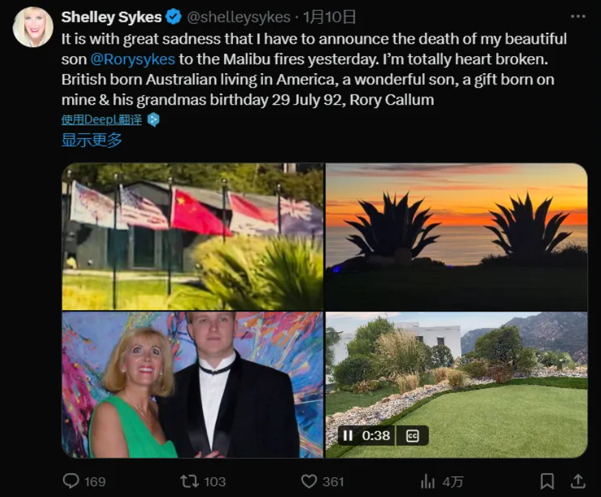 加州这地儿也不省心,总共冒出来 105 起山火,过火面积加一块儿都超 163 平方公里了,其中帕利塞德山火最是嚣张,还在一个劲儿地扩散,那些人口密集的地儿,人人都提心吊胆。澳大利亚前童星罗里・赛克斯也够倒霉的,在这洛杉矶大火里惨死。他老妈谢莉眼睁睁看着孩子身处险境,却因为消防管道里没水,啥忙都帮不上,这事儿经媒体一曝光,立马引起轩然大波。
