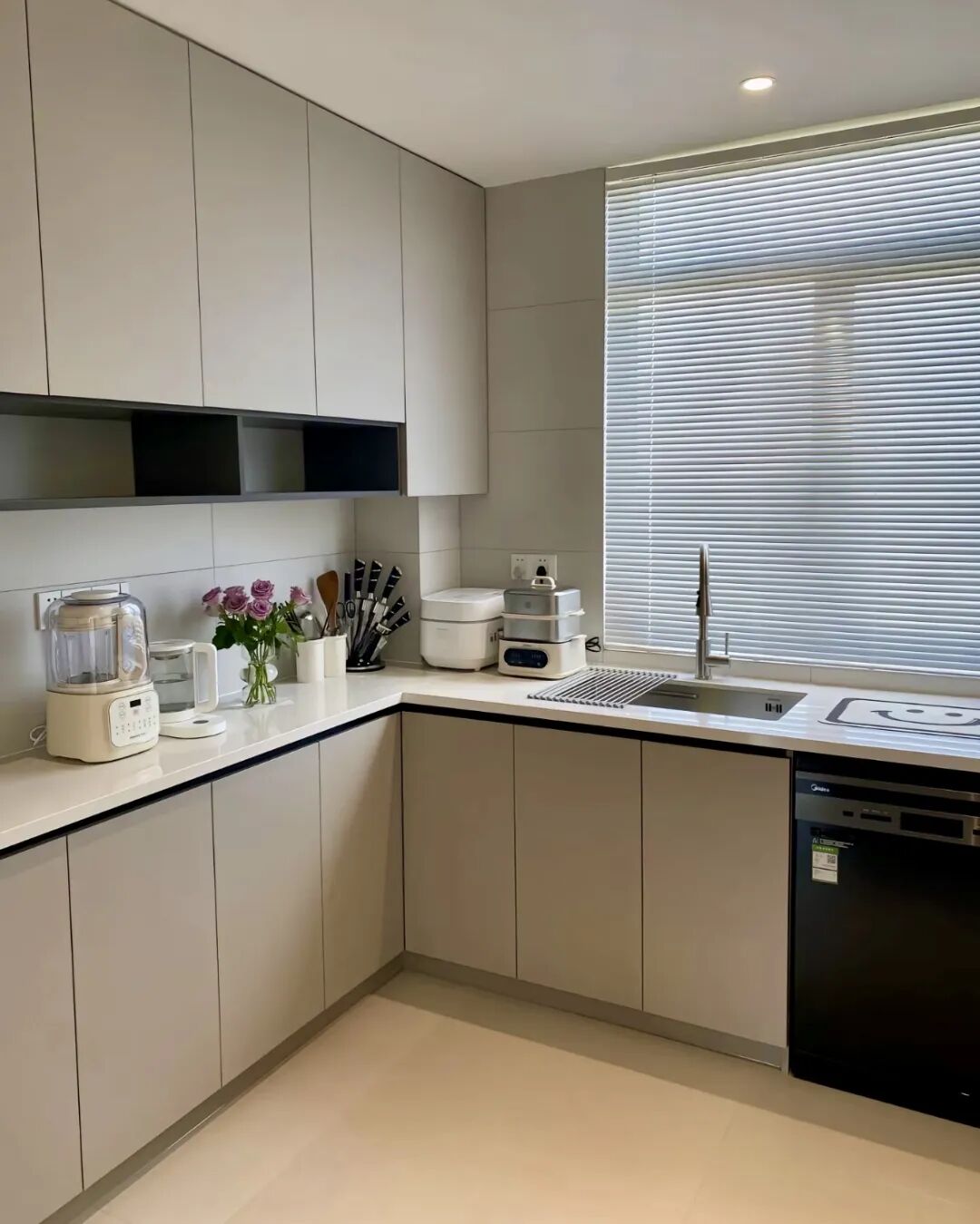 我遵循“二八原则”——80%的物品隐藏收纳,20%的常用物品美观展示。所有的厨房小电器,除非每天使用,都被请出厨房,收纳在餐厅的餐边柜中。