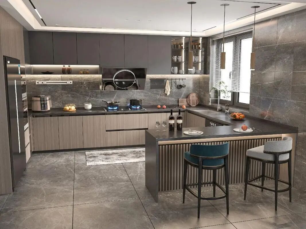 地面选择了大尺寸浅灰色瓷砖,减少缝隙带来的割裂感。有趣的是,我选择了与餐厅相同的地砖,这种无缝过渡进一步模糊了厨房边界。