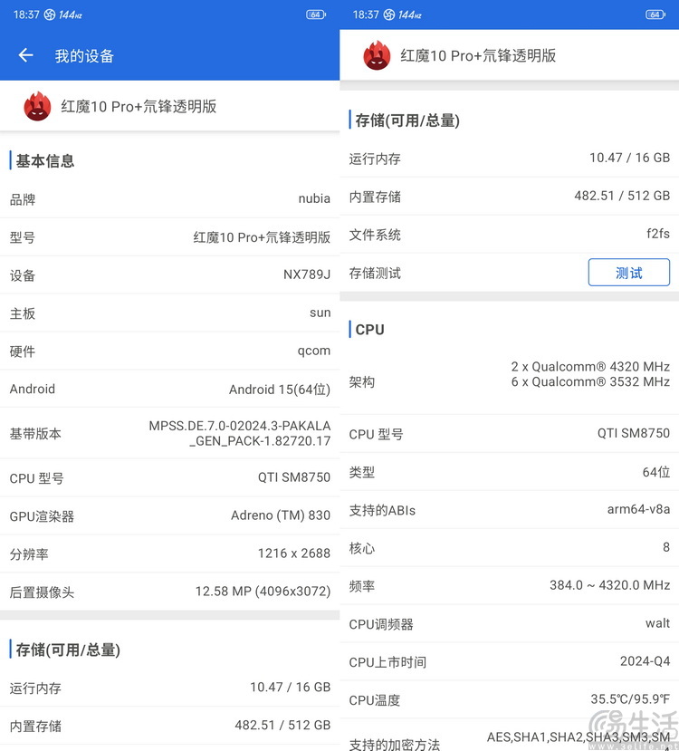 不过在SoC之外,红魔10 Pro+在硬件配置上有两个小细节是必须要提到的。其一是它全系标配频率为9600MT/s的LPDDR5X Ultra内存,而且最高提供24GB的版本。要知道刚刚亮相的新款旗舰机型,要么为了降低成本、要么为了抢上市进度,用的还是8533MT/s内存方案。相比之下,红魔10 Pro+这种“既快又好”的配置选择,很直观地展现了红魔对于玩家负责的态度,以及这个品牌如今在供应链层面的实力。