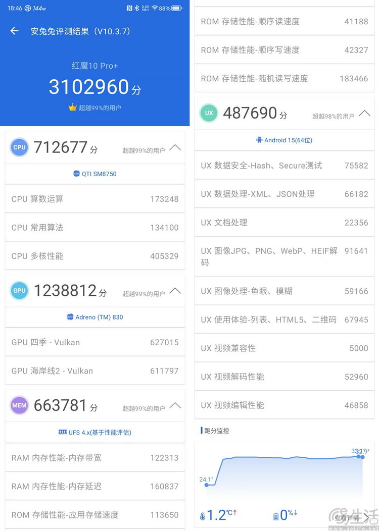 从理论性能来看,红魔10 Pro+可以跑出惊人的、堪称目前业界最强的成绩。这充分证明了电竞手机更激进的调校策略既满足了性能爱好者,同时也为红魔10 Pro+更流畅的日常使用,以及更长久的“设备寿命”打好了基础。